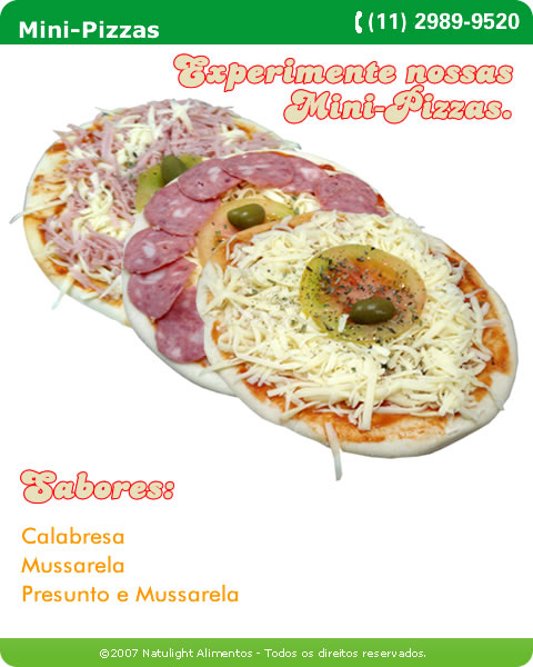 Veja nesta página nossas deliciosas mini pizzas, desenvolvidas com o mesmo carinho entre todos os outros produtos da Natulight, sinônimo e referência em produtos alimentícios.